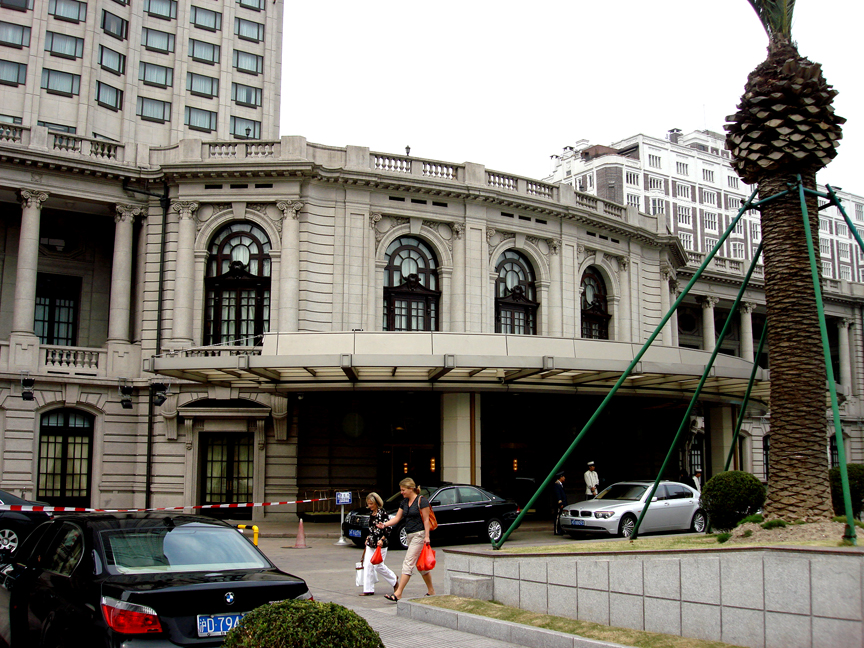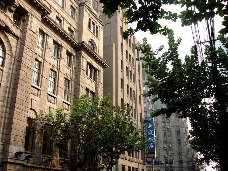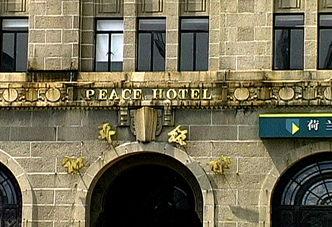 The Peace Hotel, the former "Sassoon Mansion" and later renamed the Cathay Hotel, erected in 1926-1929. On its right is the Bank of China Building, Shanghai Branch.