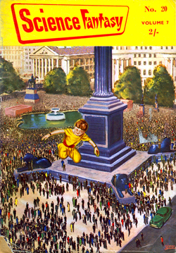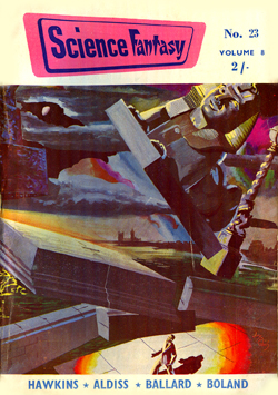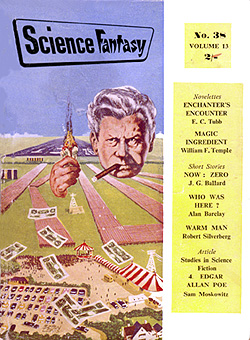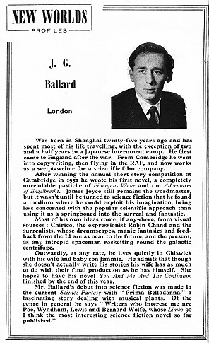 ![]() JGB in the very early days. This pix was published in the December 1956 issue of New Worlds, along with his first published story, Escapement. The profile outlines his zany cv, his favourite writers -- Poe, Wyndham, Lewis -- and the usual surreal suspects -- Dali, Ernst -- as inspirational painters. ![]() Science Fantasy, Volume 7, Number 20, December, 1956 Contains the short story, Prima Belladonna, which was reprinted in the collections, Billenium, The Four-Dimensional Nightmare, and Vermillion Sands. Ted Carnell's story blurb: "Once again we have pleasure in presenting a new author to our pages with quite a fascinating approach to fantasy. In particular, we cannot remember having read such an intriguing idea about singing plants before, although there have been stories that have referred to such a possibility." ![]() New Worlds, Volume 18, Number 54, December, 1956. Contains the short story, Escapement, which shares first-published JGB story honours with Prima Belladonna, which was also published in December, 1956. Escapement was reprinted in the collections, Passport To Eternity and The Overloaded Man. Ted Carnell's story blurb: "Mr. Ballard is a new author to our pages from whom we hope to see a lot more stories in the near future. His first story herewith (although he also has one in the current Science Fantasy) is a delightful type of Time-travel theme in a setting all too familiar to everyone -- commercial TV. But read about..." ![]() New Worlds, Volume 19, Number 55, January 1957 Contains the short story, Build-Up, which was reprinted in the collections, Billenium, and Chronopolis. It also appeared in The Disaster Area, retitled The Concentration City Ted Carnell's story blurb: "This month Mr. Ballard presents a well defined story based on the question 'When we get to the end -- what is beyond that?' In this case it is a world-wide city state of the future where the inhabitants have never known anything else but the three dimensions of their buildings." ![]() Science Fantasy, Volume 8, Number 23, June 1957 Contains the short story, Mobile, which was reprinted in the paperback collection, Billenium. It also appeared in Vermilion Sands and Worlds of If (September 1967) rewritten and retitled Venus Smiles. Ted Carnell's story blurb: "Back in the early 1930's there was published a fascinating serial entitled 'The Death of Iron,' it's title speaking for itself. It is certain that author Ballard has never read that story, yet by a reverse process he has produced as delightful an idea -- sentient, growing metal. Written with a freshness and with touches of humour that typify the modern trend of fantasy writing." ![]() New Worlds, Volume 22, Number 65, November 1957 Contains the short story, Manhole 69, which was reprinted in the collections, The Voices of time, The Disaster Area, and Chronopolis. Ted Carnell's story blurb: "Each successive story we publish by Mr. Ballard shows that he is fast becoming one of Britain's most promising new writers. This month we present one of the most powerful stories yet published in this country and one which will long be talked about by science fiction readers." ![]() New Worlds, Volume 24, Number 70, April 1958 Contains the short story, Track 12, which was reprinted in the collections, Passport To Eternity and The Overloaded Man. Ted Carnell's story blurb: "Microsonics is as fascinating a subject in today's science fiction as stories of the microcosm were twenty-five years ago. More so, in fact, because we are closer to the subject in fact rather than theory. To the best of our knowledge, Mr. Ballard's story is the first of its kind." ![]() New Worlds, Volume 30, Number 88, November 1959. Contains the short story, The Waiting Grounds which was reprinted in the paperback collections, The Voices Of Time and The Day Of Forever. Ted Carnell's story blurb: "Not for a long time have readers seen a story quite like this one. Those with extensive collections or good memories will remember the impact H. P. Lovecraft made in the middle 30's with his all-too-few science fiction stories, particularly 'At the Mountains of Madness.' Undoubtedly author Ballard has a touch of that same genius which eventually made Lovecraft great." ![]() Science Fantasy, Volume 13, Number 38, December 1959. Contains the short story, Now:Zero which was reprinted in the paperback collections, Billennium and The Overloaded Man. Ted Carnell's story blurb: "Here is another fascinating Ballard incursion into the realms of fantasy. His earlier 'Prima Belladonna,' you may remember, hit the American 'Year's Best S-F Stories 1956' and pulled more review comments than the rest of the stories in that particular collection." |