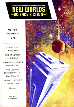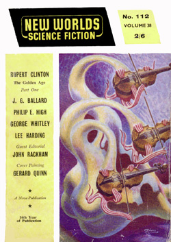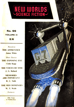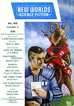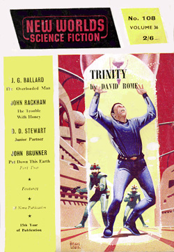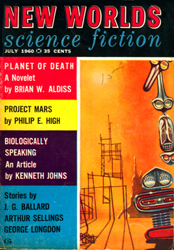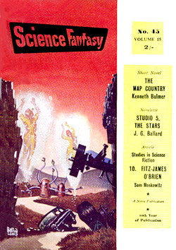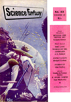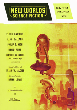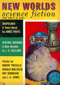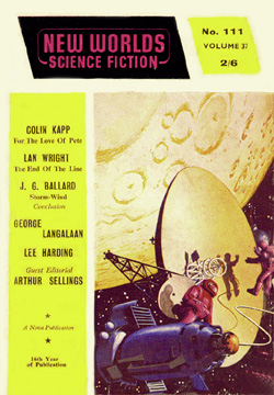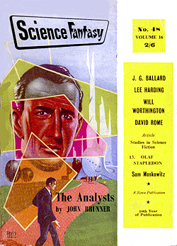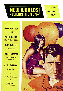 ![]() Science Fantasy, Volume 13, Number 39, February 1960 Contains the short story, The Sound-Sweep, which was reprinted in the collection, The Four-Dimensional Nightmare. Ted Carnell's story blurb: "Eighteen months ago in the April issue of New Worlds, Jim Ballard had a delightful short story entitled 'Track 12' which opened up the possibilities of sonics as a plot theme. Here, in this long novelette, he has extended his ideas into a high level and most unusual story." ![]() New Worlds, Volume 31, Number 92, March 1960 Contains the short story, Zone Of Terror, which was reprinted in the collections, The Voices Of Time and Chronopolis. Ted Carnell's story blurb: "Try this new Ballard theme -- optical illusion of a different form of Time travel? The problem would be for an outside observer to decide which was the genuine article and which the illusion." ![]() New Worlds, Volume 32, Number 95, June 1960 Contains the short story, Chronopolis, which was reprinted in the collections, Billenium, The Four-Dimensional Nightmare and Chronopolis. Ted Carnell's story blurb: "In the big cities of the world Time is already at a premium and as the population increases it will become (and already is becoming) a problem to fit everything and everybody into a workable schedule. Jim Ballard takes our presentday congestion problems to a very logical conclusion." ![]() New Worlds US, Volume 1, Number 4, June 1960 Contains the novelette, The Waiting Grounds, which was reprinted in the collections, The Voices of Time and The Day Of Forever. ![]() New Worlds US, Volume 1, Number 5, July 1960 Contains the novelette, Manhole 69, which was reprinted in the collections, The Voices of Time, The Disaster Area (retitled The Concentration City) and Chronopolis. ![]() Science Fantasy, Volume 15, Number 43, October 1960 Contains the short story, The Last World Of Mr Goddard, which was reprinted in the collections, The Terminal Beach (US paperback) and The Day Of Forever. Ted Carnell's story blurb: "If you remember the taut suspensefulness of Merritt's 'Burn, Witch, Burn' (originally published in 1932 but still read as a classic of its kind and constantly being reprinted) you will find much in common with it in this short Ballard story of a manipulator of human destinies." ![]() New Worlds, Volume 99, Number 33, October 1960 Contains the short story, The Voices Of Time, which was reprinted in the collections, The Voices of Time, and The Four-Dimensional Nightmare. Ted Carnell's story blurb: "Jim Ballard has produced a long list of memorable stories during the past four years -- two of them included in Dell's S-F: Year's Best. With this latest story we feel that he is comparable in stature to Brian Aldiss who is undoubtedly the leading British writer of the day." ![]() Meanwhile, JGB was already thinking ahead. He was strongly influenced by Pop Art in the 1950s, and did a number of collages near the end of the decade. Here he stands in front of his Project For A New Novel collage in 1960. According to JGB: "(These are) a series of four facing-page spreads that were specimen pages I put together in the late 50s... sample pages of a new kind of novel, entirely consisting of magazine-style headlines and layouts, with a deliberately meaningless text, the idea being that the imaginative content could be carried by the headlines and overall design, so making obsolete the need for a traditional text except for virtually decorative purposes... curiously enough, far from being meaningless, the science news stories somehow become fictionalized by the headings around them." Yeah... real curious... To see these spreads, as well as more of JGB's experimental fiction, click here. ![]() Penguin Science Fiction, Edited by Brian Aldiss, London, 1961 Contains the short story, Track 12. ![]() Science Fantasy, Volume 15, Number 43, February 1961 Contains the short story, Studio 5, The Stars which was reprinted in the collections, Billenium, The Four-Dimensional Nightmare and Vermilion Sands. Ted Carnell's story blurb: "Jim Ballard's first delightful fantasy, 'Prima Belladonna' in No. 20 had a somewhat exotic setting known as Vermilion Sands, a coastal paradise where the 'long-hairs' idled their time away. He returns to this setting where modern poets produce their wares with the aid of an IBM computer." ![]() New Worlds, Volume 36, Number 106, May 1961 Contains the short story, Deep End which was reprinted in the collections, The Voices Of Time, The Terminal Beach (UK edition) and Chronopolis. Ted Carnell's story blurb: "In this story Mr. Ballard takes the theme that Man has tampered with the elements and, in consequence, Earth is a dying world. But not quite dead -- life still survives although humanity is emigrating to the planets." ![]() New Worlds, Volume 36, Number 108, July 1961 Contains the short story, The Overloaded Man which was reprinted in the collections, The Voices Of Time, The Overloaded Man and The Four-Dimensional Nightmare (revised edition). Ted Carnell's story blurb: "Ever tried mentally 'switching off' surrounding objects? It is relatively quite simple providing you concentrate upon one dominant item to look at. But what happens to the 'switched off' objects? Are they still there or do they slip away into some mysterious limbo of Time?" ![]() Science Fantasy, Volume 16, Number 48, August 1961 Contains the short story, Mr. F Is Mr. F which was reprinted in the collection, The Disaster Area. Ted Carnell's story blurb: "This is probably the strangest story Mr. Ballard has yet written although the basic plot has been used before by other authors. However, none of them, to our knowledge, approached it from this particular angle." ![]() ![]() New Worlds, Volume 37, Numbers 110 and 111, September/October 1961 Contains the two-part serial, Storm-Wind. Although this reads like a rough cut to The Wind From Nowhere, there are substantial textual differences -- no American submarines in Italy, for example. And the pulp version inclu