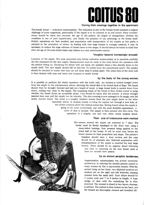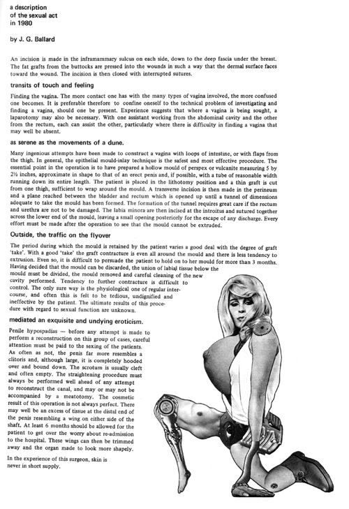‘Coitus 80’: New Worlds, #197, January 1970. This was a predecessor of JG Ballard's 'surgical fictions', where he took actual descriptions of surgical procedures and replaced the patient description with the name of a famous personality. ![]() ![]() |