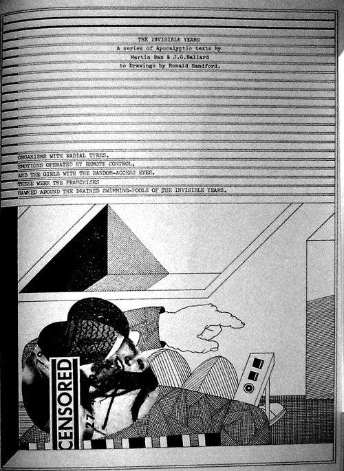 ‘The Invisible Years’: Ambit, #78, Spring 1979. The Invisible Years was a series of texts to accompany drawings by Ronald Sandford, written by Ballard, Martin Bax, and various others. The series ran for fourteen issues of Ambit, #66 to #79. The credits for all fourteen of the individual texts refer to both Ballard and Bax, although David Pringle attributes just six of these texts directly to Ballard, mainly on grounds of style, and only these six have been included. ![]() ![]() ![]() ![]() ![]() ![]() ![]() ![]()