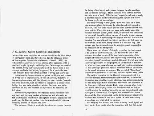 ‘Queen Elizabeth’s Rhinoplasty’: TriQuarterly, #35, Winter 1976. Another 'surgical fiction'. This one was included in the Re/Search annotated edition of The Atrocity Exhibition, but has been omitted from all U.K. editions. ![]() ![]() |