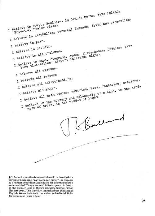 ‘What I Believe’: Interzone, #8, Summer 1984. A prose poem, originally published in French in Science Fiction #1 (ed. Daniel Riche) in January 1984.
