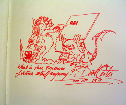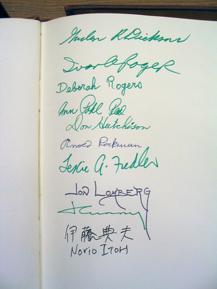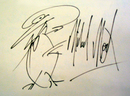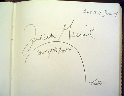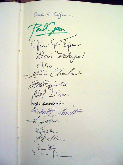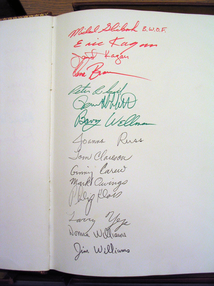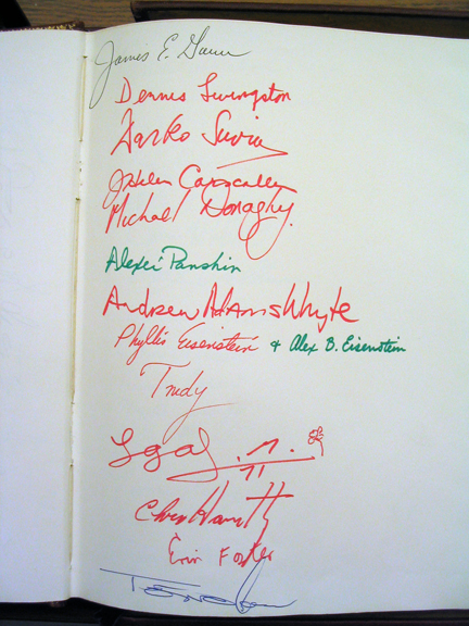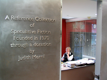 ![]() The spaceship-like office of Lorna Toolis, Head, Merril Collection of Science Fiction, Speculation and Fantasy in Toronto, Canada. Autographs From The Merril Collection's Opening Party Guest Book If you ever find yourself in Toronto, do yourself a favour and check out the Merril Collection of SF on College Street. Third largest in the world, with over "63,000 items of science fiction, fantasy and speculative fiction, as well as magic realism, experimental writing and some materials in 'fringe' areas such as parapsychology, UFOs, Atlantean legends etc." Collection head honcho Lorna Toolis has been very kind to the Terminal Collection, sharing a fantastic file of JGB memorabilia from The Man's past, most notably an incredible 8,000 word unpublished interview from 1984. I recently spent some happy moments at the Library, and was fascinated with the Collection's guest book, which, as you might surmise, has the signatures of some of the biggest and best to visit the Library. The first few pages are interesting, as they represent the guests in attendance at the Library's opening celebration. At this point in time it was called The Spaced Out Library. It was renamed in 1990. ![]() Judith Merril opens the doors on October 9, 1971. ![]() ![]() ![]() ![]() I've been told the Japanese names are Fred Pohl's translators who were travelling with him. Fred's name is halfway down... ![]() Michael Moorcock's signature, from a few years later. ![]() |