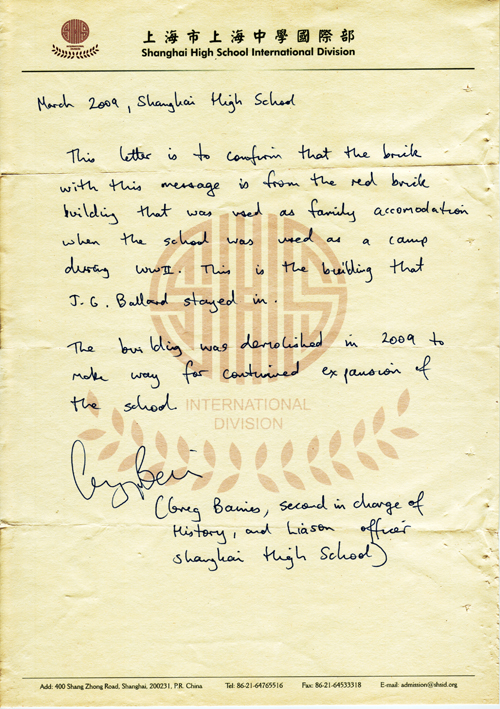 ![]() A Brick from Lunghua's G Block This all started in the Fall of 2008. I was cruising the web, following up on some JGB alerts, and I came across a blog written by one Greg Baines, a resident teacher at Shanghai High School, formerly known as Lunghua Civilian Assembly Centre. Greg had reported that the building formerly known as G Block, where Ballard and his family were interned from 1942-1945, had recently been knocked down to make way for a new swimming pool. I figured JGB would have liked that. I got in touch with Greg and he kindly offered to collect a brick for me and arrange to have it mailed to Canada. Greg and his son Lyam on the (former) G Block site. Alas, the best-laid plans. After wrapping it up and taking it to the post office to find out how much money I needed to send for postage, Chinese officials deemed the brick "dangerous" and refused to accept it for mailing. Thick as... Ever resourceful, we decided to try a courier. Yes, they'll ship it. Ordering from Canada is a rat's nest of bureaucratic blather, though, and things look complicated until we find a shipper who will do it COD. Hey presto. Four days later my little piece of Lunghua history arrived. I put it on the bookcase beside Empire of the Sun. Greg was also kind enough to include a letter of provenance: ![]() Greg also sent a number of fascinating pictures of what the old camp looks like today. To get a better idea of where these buildings are, here's a link to a large map of Lunghua drawn in 1945 by youthful internee Irene Duguid. ![]() Here is G Block before it was demolished. Not how I might have imagined the building, but you have to remember during the war there would be no trees or hedges to soften the lines. ![]() ![]() Two views for F Block, the camp's main entrance building. A Japanese flag would have flown in the area now used as a flower bed. When I visited the site in 2007, this was as far into the camp as the Chinese officials would allow me. ![]() ![]() Two views of the school's central Assembly Hall. Irene's internee map shows this structure right behind the main entrance building as "Assembly Hall" (Number 2), which appears to have a garden in front of it (see next photo). ![]() This is the area beside the large hall. During the war it was used as a vegetable garden. ![]() Greg reports "this is in between E and D Blocks, and is a really old building. I'm not sure why it wasn't drawn on the school map, perhaps an oversight?" Block D is north of this building, and this photo was taken from the south and from behind Block E. This building looks very similar to Block D but is half as large. ![]() The yellow building is very close to where G Block stood. It was constructed after the war, but done in imitation of the older buildings. ![]() This is the grounds next to the present school theatre. At the time of the camp this would have been a garden area. ![]() This is the road that runs across the north of the camp. Most of the roads on the map are still as is, but have been paved with cobble stones. This shot is of the north road running across the map toward the gate in the north east. Its near where the old kitchen would have been. ![]() And another shot of the brick. |
