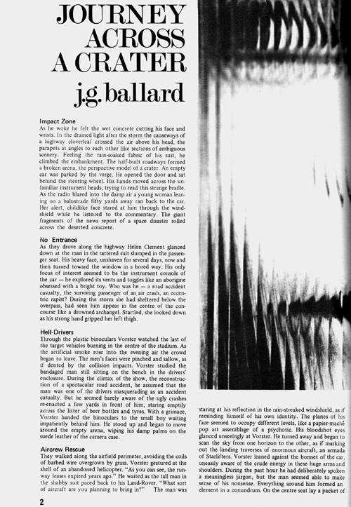 ‘Journey Across a Crater’: New Worlds, #198, February 1970. This is an early attempt to address the themes of the 1973 novel Crash in the same ‘condensed novel’ style used in The Atrocity Exhibition. Ballard has said that in his view the story didn’t really work. ![]() ![]() ![]() ![]()